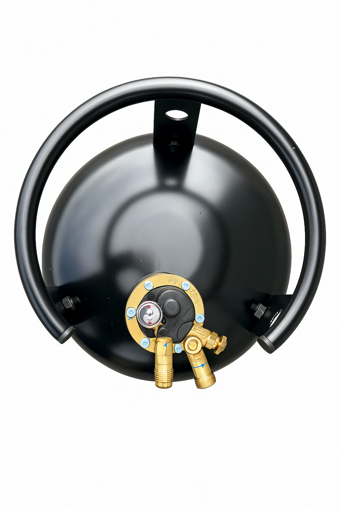 LPG-Gasflasche mit 80% Multiventil, mit französischem Anschluss (Standardanschluss für Belgien, die Niederlande, Frankreich, die Schweiz, Großbritannien). Beim Kauf montieren wir für Sie einen passenden deutschen Anschluss!